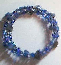 Blue Glass Seed Bead/Lapis Lazuli Memory Wire Bracelet $15.00 USD This beautiful bracelet is made out of lapis lazuli stone chips, seed bead glass complimenting the beautiful blue of the stone chips, and stainless steel memory wire. Memory wire is a coiled wire that is heat-treated to retain its shape - it will stretch a bit but it will not lose its ability to curl around the wrist securely and stay on. You do not need a fastener or clasp of any kind to keep this bracelet securely on your wrist - the coils of the bracelet. Made in many beautiful color combinations.The price of this product varies, depending on the usage of glass, semi precious, Sterling Silver or gold-filled accent metal beads, and length of the bracelet itself, per millimeter. Price includes price per mm. Charms on the end(s) of bracelet $2.00 for each bronze, brass, pewter or Stainless steel charm attached, $3.00 per charm attached if charm is Sterling Silver or Gold filled. List of materials used for bracelet and price listed on package. |