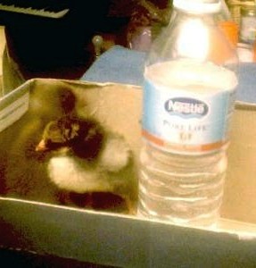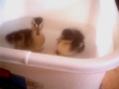 Picture 2: Babies Rhodie the brown duckling and Sparrow the chick. Water bottle is is the box with them to show how tiny they were when I brought them home. Picture 3: Protective Big Sister Twee Quackette (L), Little Blackfoot (C), and still in the egg, Little Junebug (R).
